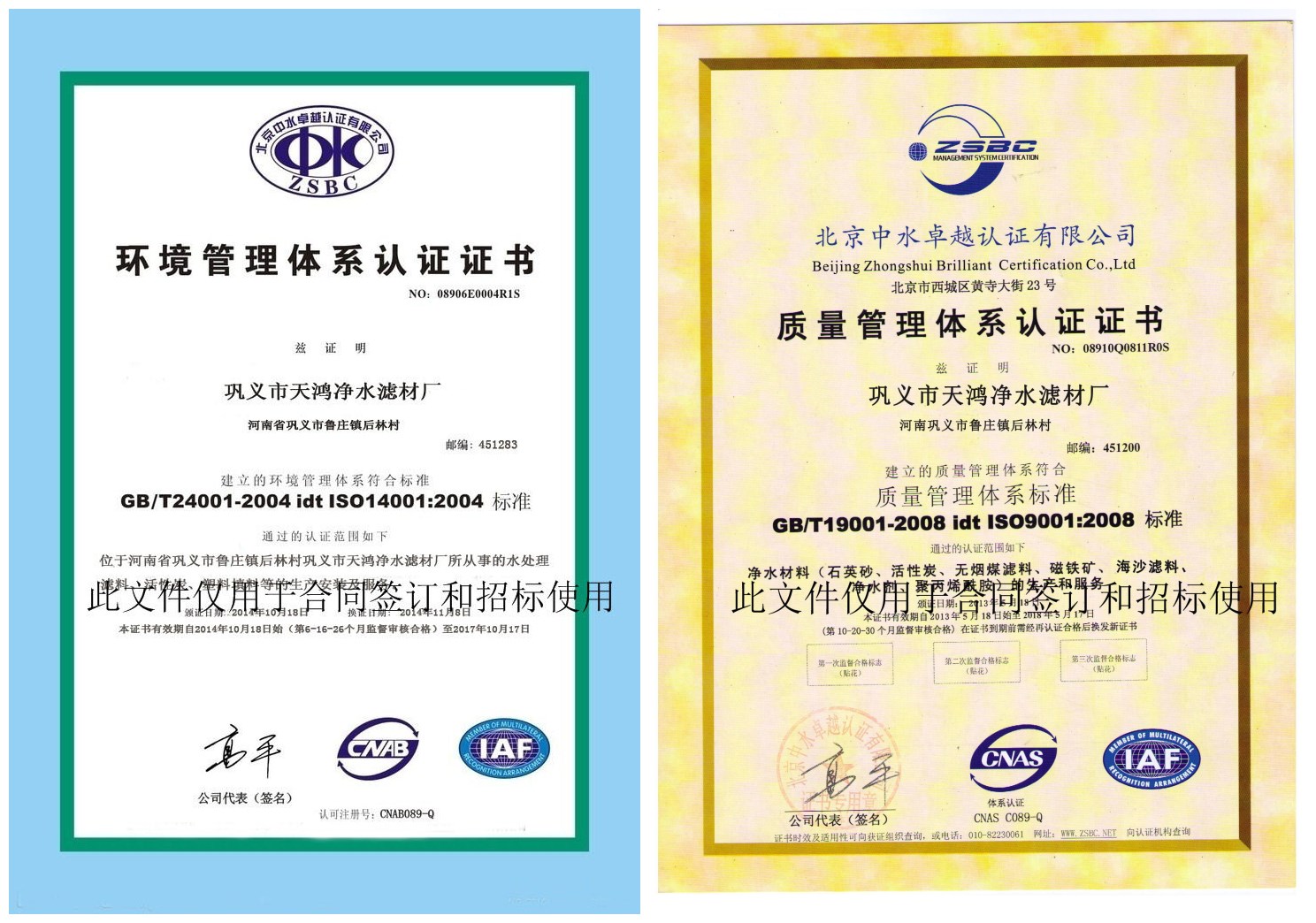 3. 天鴻有ISO質量認證、部分產品涉水衛生許可證,更有北京公司認證的質量管理體系證書、環境 管理體系證書。